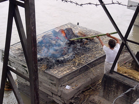 Luego de la ceremonia de despedida (chantings, ofrendas al agua, etc.) en unos leños acomodados de manera que forman una suerte de cama, el cuerpo es colocado tapado por una tela cubierta a su vez de paja seca. A eso se le prende candela y ya. El fuego dura como dos horas y pico en consumir todo. Una vez terminada la ceremonia los dolientes se han ido y queda sólo el encargado de finiquitar la cremación. Este revuelve los restos y se asegura de que todo quede bien quemado y reducido a cenizas. Vimos como hacía esto y es impresionante en lo que termina un cuerpo que vivió toda una vida, amó, sufrió, disfrutó, rió, lloró, etc.: en restos ensartados en una vara siendo acomodados entre los carbones prendidos para que sean consumidos totalmente. Una vez que sólo hay cenizas, sin ninguna contemplación son barridas al agua por el cremador quien se dispondrá a acomodar otra cama de leños para el siguiente cuerpo.