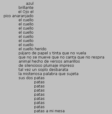 Poesía en forma de pájaro le organiza un homenaje publicando la imagen de este poema e invitando a quienes se quieran sumar al mismo a ponerlo en sus blogs y mandar un mensaje a la dirección electrónica poesiaenformadepajaro@gmail.com informando de dicha participación. Aquí nos sumamos al homenaje.