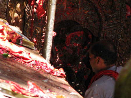Ofrenda de sangre en el santuario dedicado a la diosa Kali (Dhakshinkali) en los alrededores de Pharping, Nepal