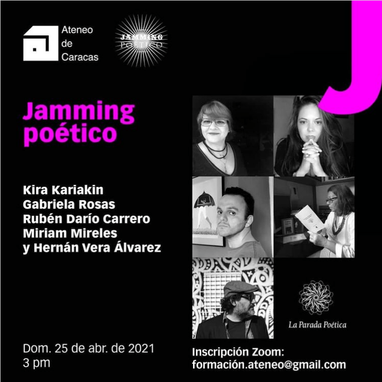 ¿Quieren Jamming? Este domingo #25deabril 3 pm nos estamos viendo los poetas @magabrielarosas @vuelapalabra @Miriam_Mireles #HernánVeraÁlvarez (Argentina) y yo para un #jammingpoético celebratorio en coincidencia con la semana del #díainternacionaldellibro que fue este viernes #23deAbril.