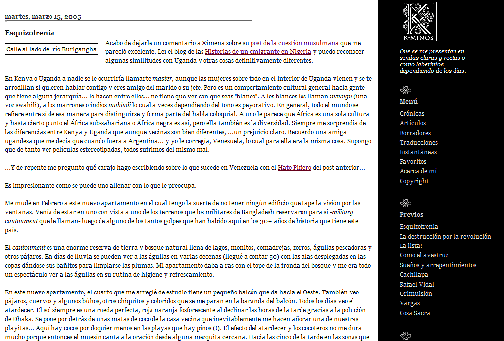 Este texto lo escribí para la primera publicación de este blog en el 2001. Esa versión fue borrada de una instalación que tenía independiente con movable type. Luego lo volví a instalar en otro servidor y me lo volvieron a borrar en el 2003. Y esta tercera versión ininterrumpida, instalada en el 2004, es la que sobrevive porque estuvo primero en blogger y luego en wordpress que es donde florece estacionalmente cuando me ocupo. Según la investigadora venezolana Iria Puyosa, este fue el segundo blog venezolano y el primero de corte literario. Realmente, no estuve al tanto hasta que ella me lo comentó luego de una investigación que hiciera. Para mí, sigue siendo fundamental tener el blog aunque escriba esporádicamente en él. Es como tener una otra casa imprescindible.