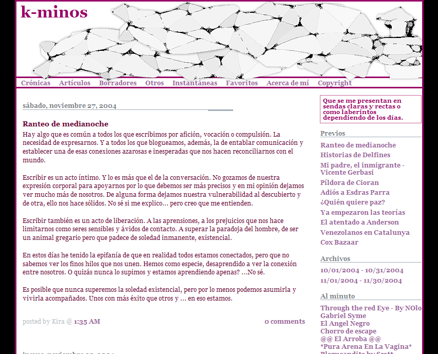 Este sitio se llama K-minos porque sencillamente se me ocurrió mientras diseñaba la página. Me acordé de la canción de Joan Manuel con los versos de Machado, me acordé del rey Minos, de la cultura minoica, del minotauro, de los laberintos de Borges y me pareció de lo más intelectual y apropiado porque además podía incluir la letra de mi nombre sin tanto rollo. Después de todo este proyecto también es un ego-trip.